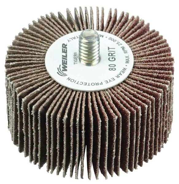 Weiler Tiger premium aluminum oxide 2 inch coated abrasive flap wheels provide fast cutting and long life on steel and other metals. The 1/4 inch-20 threaded stem allows for easy mounting on a die grinder or right angle die grinder. The flap wheel can be dressed to conform to an application part. A solid hub construction increases balance and reduced vibration in applications such as tube ID cleaning, thread cleaning and deburring.