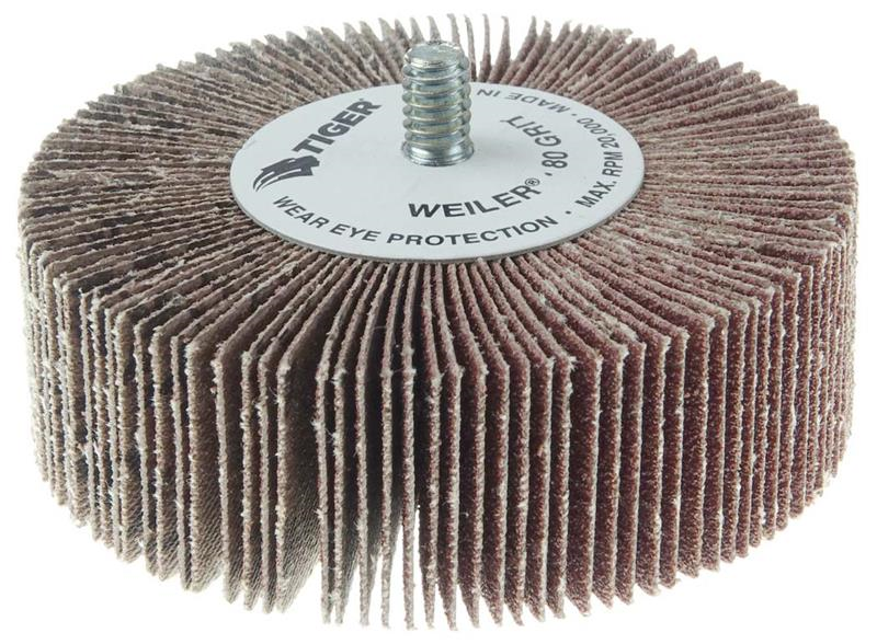 Weiler Tiger premium aluminum oxide 3 inch coated abrasive flap wheels provide fast cutting and long life on steel and other metals. The 1/4 inch-20 threaded stem allows for easy mounting on a die grinder or right angle die grinder. The flap wheel can be dressed to conform to an application part. A solid hub construction increases balance and reduced vibration in applications such as tube ID cleaning, thread cleaning and deburring.