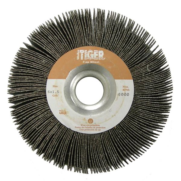 Weiler Tiger premium aluminum oxide 6 inch unmounted coated abrasive flap wheels provide fast cutting and long life on steel and other metals. The 1 inch arbor hole allows for easy mounting on a bench grinder or straight grinder. The flap wheel can be dressed to conform to an application part. A solid hub construction provides balance leading to smooth chatter-free finishing in applications such as tube ID cleaning, thread cleaning and deburring.