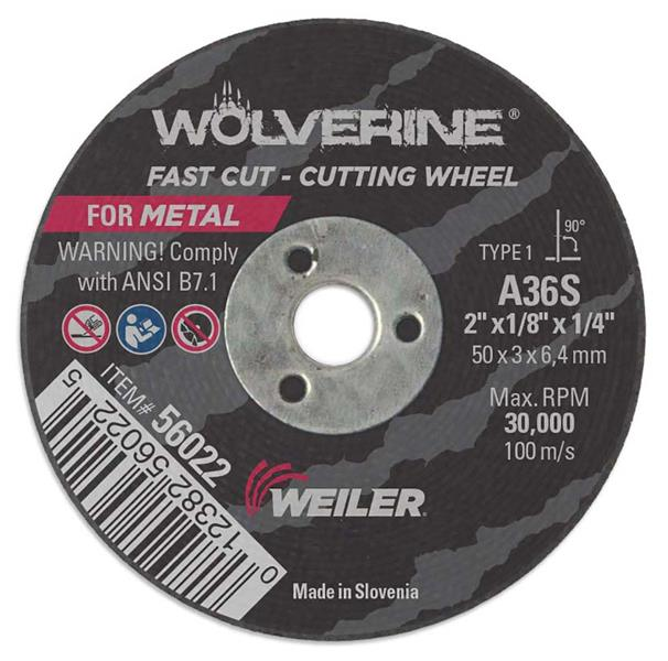 Weiler Wolverine 2 inch type 1 cutting wheels deliver a fast cut rate and consistent performance at a good value when cutting steel and other metals. The flat profile allows for deep cuts and 1/8" thickness is ideal for notching with a Cut-off Tool. The 1/4" open arbor offers a cost-effective mounting option when using adapting nuts.