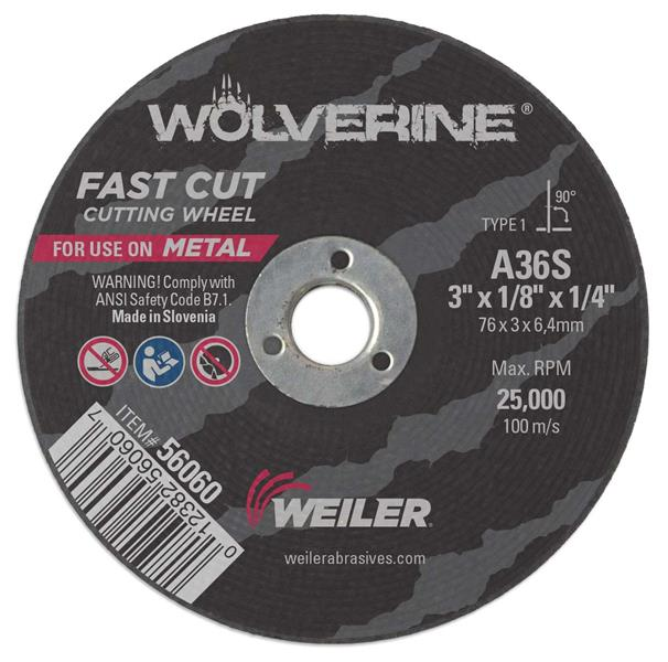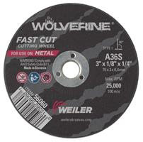 Weiler Wolverine 3 inch type 1 cutting wheels deliver a fast cut rate and consistent performance at a good value when cutting steel and other metals. The flat profile allows for deep cuts and 1/8" thickness is ideal for notching with a Cut-off Tool. The 1/4" open arbor offers a cost-effective mounting option when using adapting nuts.