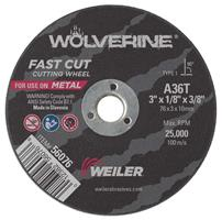 Weiler Wolverine 3 inch type 1 cutting wheels deliver a fast cut rate and consistent performance at a good value when cutting steel and other metals. The flat profile allows for deep cuts and 1/8" thickness is ideal for notching with a Cut-off Tool. The 1/4" open arbor offers a cost-effective mounting option when using adapting nuts.