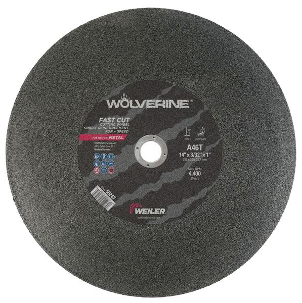 Weiler Wolverine large 14 inch cutting wheels deliver a fast cut rate and consistent performance at a good value when cutting steel and other metals. A single layer of fiberglass reinforcement in the center of the wheel provides ultra-fast cutting speed and reduces burrs with a chop saw.