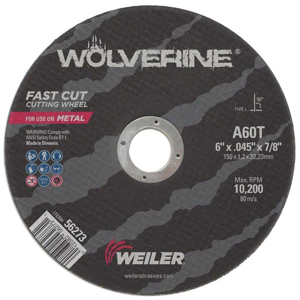 Weiler Wolverine 6 inch type 1 cutting wheels deliver a fast cut rate and consistent performance at a good value when cutting steel and other metals. The flat type 1 profile allows for deep cuts commonly required when cutting metal. The .045 wheel thickness is ideal for cutting tubes, bar stock, and large cross-sections with a right angle grinder.