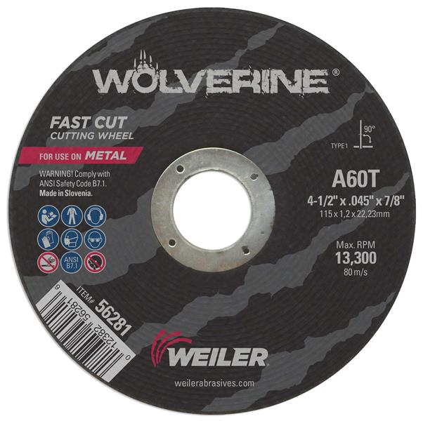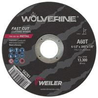 Weiler Wolverine 4.5 inch type 1 cutting wheels deliver a fast cut rate and consistent performance at a good value when cutting steel and other metals. The flat type 1 profile allows for deep cuts commonly required when cutting metal. The .045 wheel thickness is ideal for cutting tubes, bar stock, and large cross-sections with a right angle grinder.