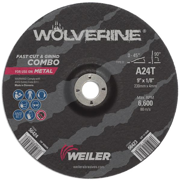 Weiler Wolverine 7 inch type 27 combo wheels deliver a fast cut rate and consistent performance at a good value when cutting and grinding steel and other metals. Combination wheels offer flexibility and efficiency when switching between cutting and grinding applications with a right angle grinder. The 7/8" open arbor offers a cost-effective mounting option when using adapting nuts.