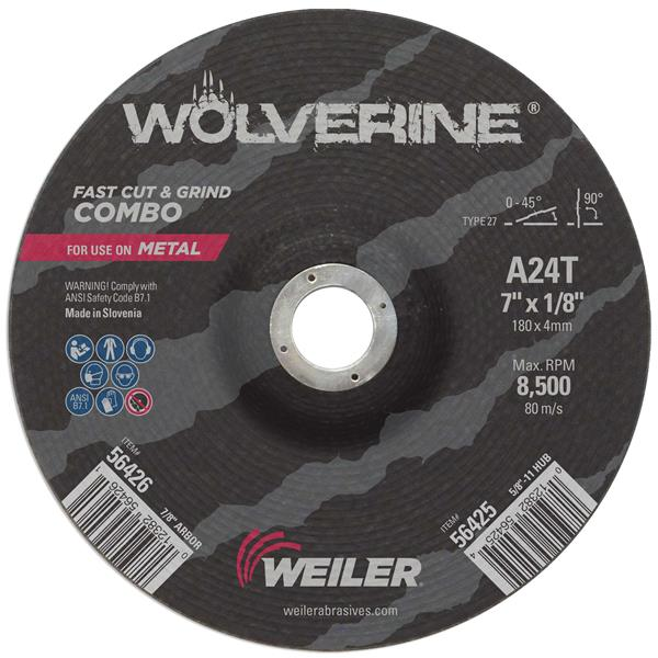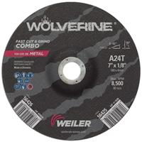 Weiler Wolverine 7 inch type 27 combo wheels deliver a fast cut rate and consistent performance at a good value when cutting and grinding steel and other metals. Combination wheels offer flexibility and efficiency when switching between cutting and grinding applications with a right angle grinder. The 7/8" open arbor offers a cost-effective mounting option when using adapting nuts.