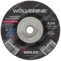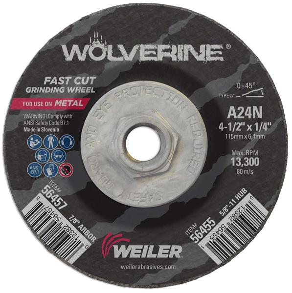 Weiler Wolverine 4.5 inch type 27 grinding wheels deliver a fast cut rate and consistent performance at a good value when grinding steel and other metals. Flat profile with depressed center allows for a wide range of grinding angles (0-45) with a right angle grinder. Ideal for heavy stock removal, scale removal, weld removal, weld blending, edge beveling and torch-cut softening. Small 5/8"-11 nutted metal hub reduces gouging of the workpiece and allows for 30% more usable surface area of the wheel in addition to providing quick spin-on, spin-off changeover of a standard hub.