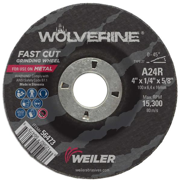 Weiler Wolverine 4 inch type 27 grinding wheels deliver a fast cut rate and consistent performance at a good value when grinding steel and other metals. Flat profile with depressed center allows for a wide range of grinding angles (0-45) with a grinder. Ideal for heavy stock removal, scale removal, weld removal, weld blending, edge beveling and torch-cut softening. The 5/8" open arbor offers a cost-effective mounting option when using adapting nuts.