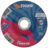 Weiler Tiger aluminum oxide 5 inch type 27 depressed center cutting wheels deliver the right combination of performance and value when cutting steel and other metals. The depressed center provides added clearance when working at a constrained angle and .045heel thickness is ideal for cutting tubes, bar stock and large cross-sections with a right angle grinder.