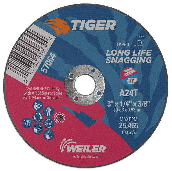 3 in. x 1/4 in. 24 Grit Aluminum Oxide (A24T) 3/8 in. Arbor Hole Tiger AO Type 1 Snagging Wheel