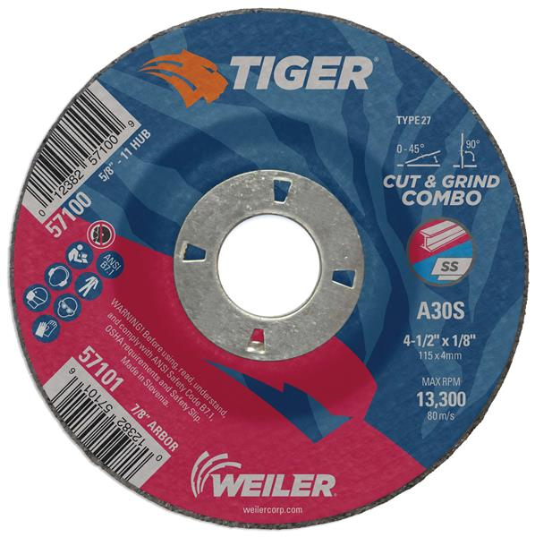 Weiler Tiger aluminum oxide 4.5 inch type 27 combo wheels deliver the right combination of performance and value when cutting and grinding steel and other metals. Combination wheels offer flexibility and efficiency when switching between cutting and grinding with a right angle grinder. The open arbor offers a cost-effective mounting option when using adapting nuts.