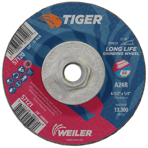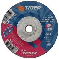 Weiler Tiger aluminum oxide 4.5 inch type 27 grinding wheels deliver the right combination of performance and value when grinding steel and other metals. The flat profile of the wheel in combination with depressed center allows for a wide range of grinding angles (0-45 These 1/4 inch grinding wheels are ideal for heavy stock removal, scale removal, weld removal, weld blending, edge beveling, and torch-cut softening with a right angle grinder. A smaller hub on 4.5 inch wheels keeps the wheel from gouging valuable parts as well as allowing for 30% more usable wheel area.