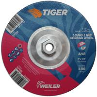 Weiler Tiger aluminum oxide 7 inch type 28 depressed center grinding wheels deliver the right combination of performance and value when grinding steel and other metals. This depressed center wheel with a concave "or saucer" shape is designed for increased aggression at lower working angles and increased access. The 1/4" wheel thickness is ideal for heavy stock removal, scale removal, weld removal, weld blending, edge beveling and torch-cut softening with a right angle grinder. The 5/8"-11 nutted metal hub allows for quick spin-on, spin-off changeover and eliminates cross-threading or sticking to spindle due to heat build-up.