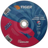 Weiler Tiger aluminum oxide 9 inch type 28 depressed center grinding wheels deliver the right combination of performance and value when grinding steel and other metals. This depressed center wheel with a concave "or saucer" shape is designed for increased aggression at lower working angles and increased access. The 1/4" wheel thickness is ideal for heavy stock removal, scale removal, weld removal, weld blending, edge beveling and torch-cut softening with a right angle grinder. The 7/8" open arbor offers a cost-effective mounting option when using adapting nuts.