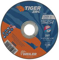 Tiger Zirc 4.5 inch type 1 cutting wheels cut faster and last longer so you get proven productivity at an exceptional total cost. The self-sharpening zirconia alumina grains retain a high cut rate throughout the life of the wheel while a hard bond delivers long wheel life for heavy duty applications. The flat type 1 profile allows for deep cuts commonly required when cutting metal. The .045heel thickness is ideal for cutting tubes, bar stock, and large cross-sections with a right angle grinder.