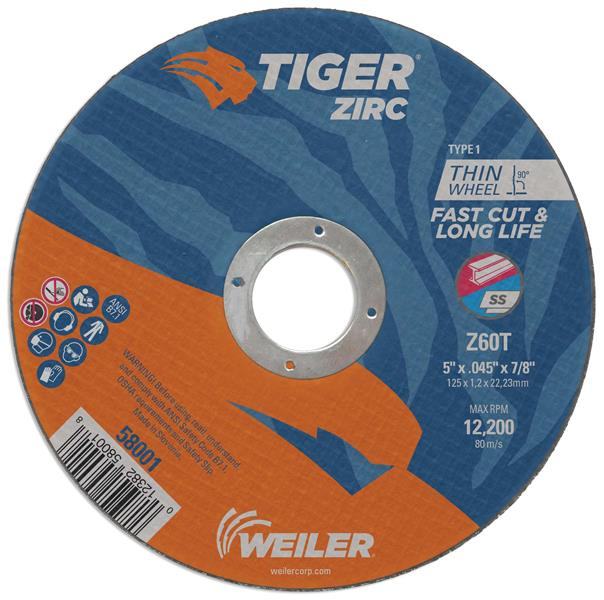 Tiger Zirc 5 inch type 1 cutting wheels cut faster and last longer so you get proven productivity at an exceptional total cost. The self-sharpening zirconia alumina grains retain a high cut rate throughout the life of the wheel while a hard bond delivers long wheel life for heavy duty applications. The flat type 1 profile allows for deep cuts commonly required when cutting metal. The .045heel thickness is ideal for cutting tubes, bar stock, and large cross-sections with a right angle grinder.