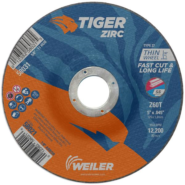 Tiger Zirc 5 inch type 27 depressed center cutting wheels cut faster and last longer so you get proven productivity at an exceptional total cost. The self-sharpening zirconia alumina grains retain a high cut rate throughout the life of the wheel while a hard bond delivers long wheel life for heavy duty applications. The depressed center provides added clearance when working at a constrained angle. The .045heel thickness is ideal for cutting tubes, bar stock, and large cross-sections with a right angle grinder.