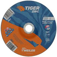 Tiger Zirc 7 inch type 27 depressed center cutting wheels cut faster and last longer so you get proven productivity at an exceptional total cost. The self-sharpening zirconia alumina grains retain a high cut rate throughout the life of the wheel while a hard bond delivers long wheel life for heavy duty applications. The flat profile of the wheel in combination with depressed center allows for a wide range of grinding angles (0-45 The .060" wheel thickness is ideal for cutting tubes, bar stock, and large cross-sections with a right angle grinder. The 7/8" open arbor offers a cost-effective mounting option when using adapting nuts.