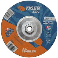 Tiger Zirc 7 inch type 27 depressed center cutting wheels cut faster and last longer so you get proven productivity at an exceptional total cost. The self-sharpening zirconia alumina grains retain a high cut rate throughout the life of the wheel while a hard bond delivers long wheel life for heavy duty applications. The flat profile of the wheel in combination with depressed center allows for a wide range of grinding angles (0-45 The .060" wheel thickness is ideal for cutting tubes, bar stock, and large cross-sections with a right angle grinder. 5/8"-11 nutted metal hub allows for quick spin-on, spin-off changeover and eliminates cross-threading or sticking to spindle due to heat build-up.