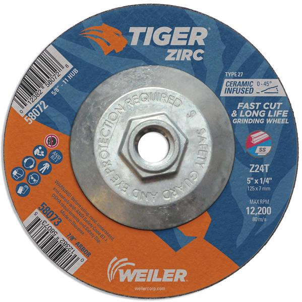 Tiger Zirc 5 inch type 27 grinding wheels cut faster and last longer so you get proven productivity at an exceptional total cost. The self-sharpening zirconia alumina grains retain a high cut rate throughout the life of the wheel while a hard bond delivers long wheel life for heavy duty applications. The flat profile with depressed center allows for a wide range of grinding angles (0-45 1/4" wheel thickness is ideal for heavy stock removal, scale removal, weld removal, weld blending, edge beveling and torch-cut softening with a right angle grinder. The 5/8"-11 nutted metal hub allows for quick spin-on, spin-off changeover and eliminates cross-threading or sticking to spindle due to heat build-up.