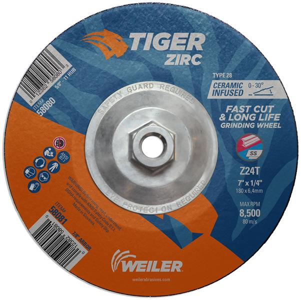 Tiger Zirc 7 inch type 28 grinding wheels cut faster and last longer so you get proven productivity at an exceptional total cost. The self-sharpening zirconia alumina grains retain a high cut rate throughout the life of the wheel while a hard bond delivers long wheel life for heavy duty applications. This depressed center wheel with a concave "or saucer" shape is designed for increased aggression at lower working angles and increased access. 1/4" wheel thickness is ideal for heavy stock removal, scale removal, weld removal, weld blending, edge beveling and torch-cut softening with a right angle grinder. The 5/8"-11 nutted metal hub allows for quick spin-on, spin-off changeover and eliminates cross-threading or sticking to spindle due to heat build-up.