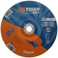 Tiger Zirc 9 inch type 28 grinding wheels cut faster and last longer so you get proven productivity at an exceptional total cost. The self-sharpening zirconia alumina grains retain a high cut rate throughout the life of the wheel while a hard bond delivers long wheel life for heavy duty applications. This depressed center wheel with a concave "or saucer" shape is designed for increased aggression at lower working angles and increased access. 1/4" wheel thickness is ideal for heavy stock removal, scale removal, weld removal, weld blending, edge beveling and torch-cut softening with a right angle grinder. The 7/8" open arbor offers a cost-effective mounting option when using adapting nuts.