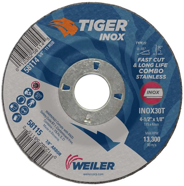 Tiger INOX 4.5 inch type 27 combo wheels are specifically designed for high performance when cutting and grinding stainless steel. These wheels incorporate a Contaminant-free bond that delivers a worry-free solution for stainless steel applications. Combination wheels offer flexibility and efficiency when switching between cutting and grinding applications with a right angle grinder. The 7/8" open arbor offers a cost-effective mounting option when using adapting nuts.