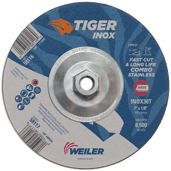 Tiger INOX 7 inch type 27 combo wheels are specifically designed for high performance when cutting and grinding stainless steel. These wheels incorporate a Contaminant-free bond that delivers a worry-free solution for stainless steel applications. Combination wheels offer flexibility and efficiency when switching between cutting and grinding applications with a right angle grinder. The 5/8"-11 nutted metal hub allows for quick spin-on, spin-off changeover and eliminates cross-threading or sticking to spindle due to heat build-up.