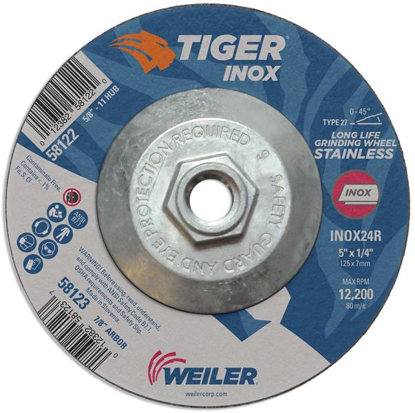 Tiger INOX 5 inch type 27 grinding wheels are specifically designed for high performance when grinding stainless steel. These wheels incorporate a Contaminant-free bond that delivers a worry-free solution for stainless steel applications. The flat profile with depressed center allows for a wide range of grinding angles (0-45 1/4" wheel thickness is ideal for heavy stock removal, scale removal, weld removal, weld blending, edge beveling and torch-cut softening with a right angle grinder. The 5/8"-11 nutted metal hub allows for quick spin-on, spin-off changeover and eliminates cross-threading or sticking to spindle due to heat build-up.