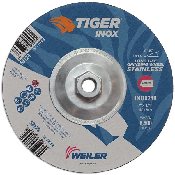 Tiger INOX 7 inch type 27 grinding wheels are specifically designed for high performance when grinding stainless steel. These wheels incorporate a Contaminant-free bond that delivers a worry-free solution for stainless steel applications. The flat profile with depressed center allows for a wide range of grinding angles (0-45 1/4" wheel thickness is ideal for heavy stock removal, scale removal, weld removal, weld blending, edge beveling and torch-cut softening with a right angle grinder. The 5/8"-11 nutted metal hub allows for quick spin-on, spin-off changeover and eliminates cross-threading or sticking to spindle due to heat build-up.