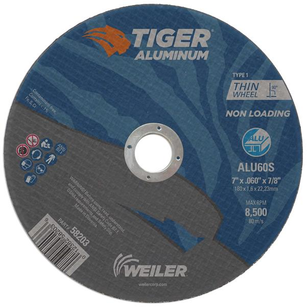 Tiger Aluminum 7 inch type 1 cutting wheels are specifically designed for high performance cutting and extended wheel life on aluminum. These wheels blend abrasive grains with Weiler's non-loading formula, resulting in a fast and consistent cut rate on aluminum. The flat profile allows for deep cuts and .060" wheel thickness is ideal for cutting tubes, bar stock and large cross-sections with a right angle grinder. The 7/8" open arbor offers a cost-effective mounting option when using adapting nuts.
