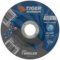 Tiger Aluminum 4.5 inch type 27 depressed center cutting wheels are specifically designed for high performance cutting and extended wheel life on aluminum. These wheels blend abrasive grains with Weiler's non-loading formula, resulting in a fast and consistent cut rate on aluminum. The depressed center provides added clearance when working at a constrained angle. Wheel thickness of .045is ideal for cutting tubes, bar stock and large cross-sections with a right angle grinder. The 7/8" open arbor offers a cost-effective mounting option when using adapting nuts.