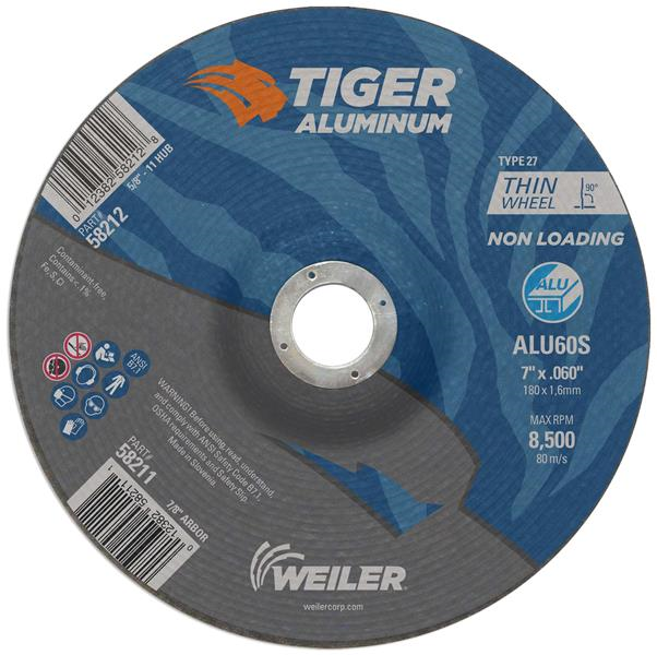 Tiger Aluminum 7 inch type 27 depressed center cutting wheels are specifically designed for high performance cutting and extended wheel life on aluminum. These wheels blend abrasive grains with Weiler's non-loading formula, resulting in a fast and consistent cut rate on aluminum. The depressed center provides added clearance when working at a constrained angle. Wheel thickness of .060" is ideal for cutting tubes, bar stock and large cross-sections with a right angle grinder. The 7/8" open arbor offers a cost-effective mounting option when using adapting nuts.