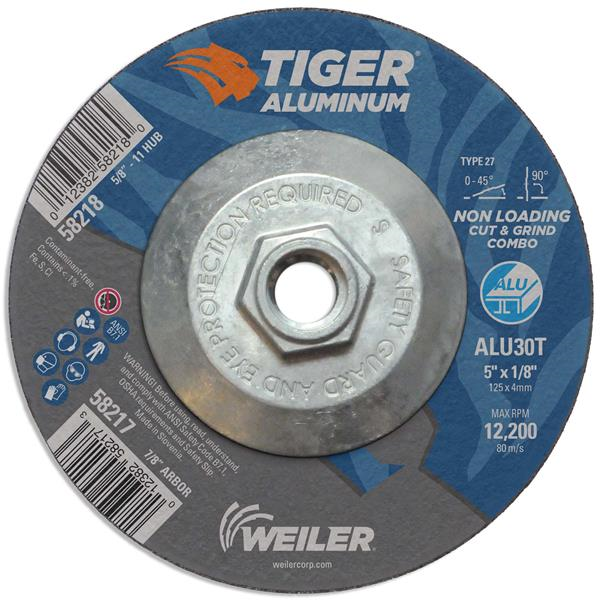 Tiger Aluminum 5 inch type 27 combo wheels are specifically designed for high performance cutting and grinding and extended wheel life on aluminum. These wheels blend abrasive grains with Weiler's non-loading formula, resulting in a fast and consistent cut rate on aluminum. Combination wheels offer flexibility and efficiency when switching between cutting and grinding applications with a right angle grinder. The 5/8"-11 nutted metal hub allows for quick spin-on, spin-off changeover and eliminates cross-threading or sticking to spindle due to heat build-up.
