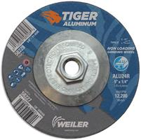 Tiger Aluminum 5 inch type 27 grinding wheels are specifically designed for high performance grinding and extended wheel life on aluminum. These wheels blend abrasive grains with Weiler's non-loading formula, resulting in a fast and consistent cut rate on aluminum. The flat profile with depressed center allows for a wide range of grinding angles (0-45 with a right angle grinder. Ideal for heavy stock removal, scale removal, weld removal, weld blending, edge beveling and torch-cut softening. The 5/8"-11 nutted metal hub allows for quick spin-on, spin-off changeover and eliminates cross-threading or sticking to spindle due to heat build-up.