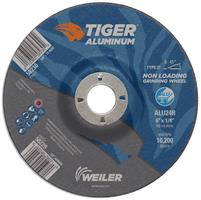 Tiger Aluminum 6 inch type 27 grinding wheels are specifically designed for high performance grinding and extended wheel life on aluminum. These wheels blend abrasive grains with Weiler's non-loading formula, resulting in a fast and consistent cut rate on aluminum. The flat profile with depressed center allows for a wide range of grinding angles (0-45 with a right angle grinder. Ideal for heavy stock removal, scale removal, weld removal, weld blending, edge beveling and torch-cut softening. The 7/8" open arbor offers a cost-effective mounting option when using adapting nuts.