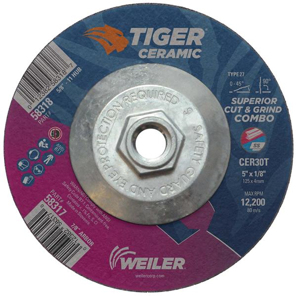 With Tiger Ceramic 5 inch type 27 combo wheels, there's no more compromise when cutting or grinding the toughest metals. Now you can maximize your time on the job with a superior combination of life and cut rate for maximum productivity. Self-sharpening and cool cutting, ceramic grains remove material effortlessly while a hard bond keeps working longer. Combination wheels offer flexibility and efficiency when switching between cutting and grinding applications.