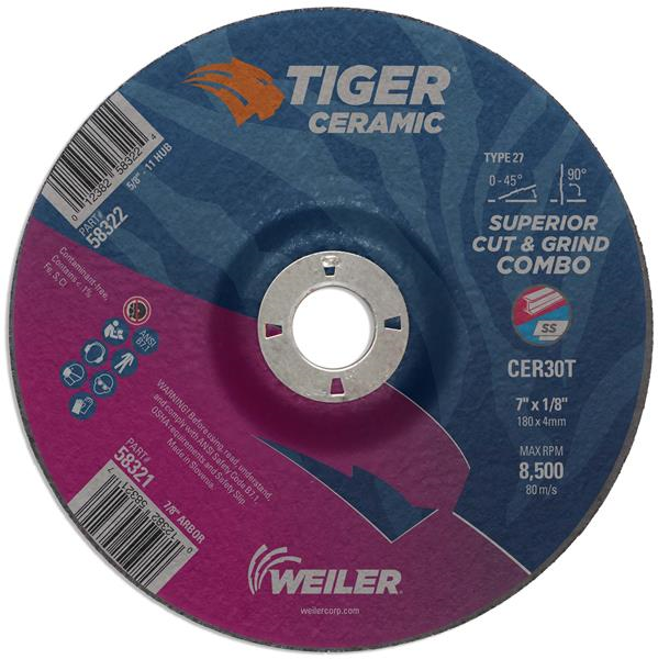 With Tiger Ceramic 7 inch type 27 combo wheels, there's no more compromise when cutting or grinding the toughest metals. Now you can maximize your time on the job with a superior combination of life and cut rate for maximum productivity. Self-sharpening and cool cutting, ceramic grains remove material effortlessly while a hard bond keeps working longer. Combination wheels offer flexibility and efficiency when switching between cutting and grinding applications.