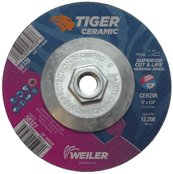 With Tiger Ceramic 5 inch type 27 depressed center grinding wheels, there's no more compromise when grinding the toughest metals. Now you can maximize your time on the job with a superior combination of life and cut rate for maximum productivity. Self-sharpening and cool cutting, ceramic grains remove material effortlessly while a hard bond keeps working longer. The flat profile of the wheel in combination with depressed center allows for a wide range of grinding angles (0-45).