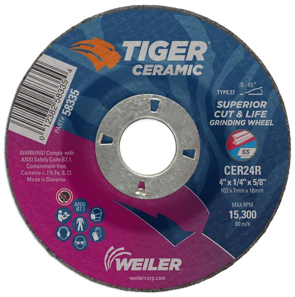 With Tiger Ceramic 4 inch type 27 depressed center grinding wheels, there's no more compromise when grinding the toughest metals. Now you can maximize your time on the job with a superior combination of life and cut rate for maximum productivity. Self-sharpening and cool cutting, ceramic grains remove material effortlessly while a hard bond keeps working longer. The flat profile of the wheel in combination with depressed center allows for a wide range of grinding angles (0-45).