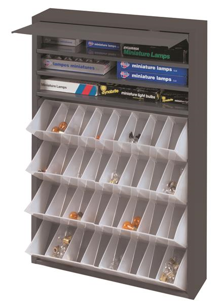 Tilt-Out Tray Dispensing Cabinet. Constructed using prime cold rolled steel. 4 Durable clear plastic tilt-out trays. 28 Adjustable dividers are included allowing the creation of from 4 to 32 compartments. Ideal for the storage and organization of automotive bulbs, fuses, terminals, fasteners and more. Back-up storage shelves are located behind hinged cover. Cover provides ideal space for logos or signs. Unit can be wall hung using keyholes punched in the back. Gray powder coat finish.