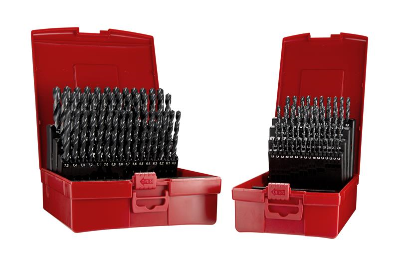 The A190202 drill set has 51 different metric diameter drills, all in size order in a sturdy plastic case so selecting the required drill size very simple. The drills in the A190202 are Dormer?s A100 jobber drills. These have a standard 118 degree split point to give strength and make the point easy to regrind. The A100 can be used for both hand held and machine drilling in many applications and has a steam oxide finish which helps prevent work piece material build up on the edge of the drill. A number of materials can be drilled using the A100 including steels, aluminium and stainless steels. With a very good range of 51 different smaller size diameters of our best-selling A100 drill, the A190202 metric drill set has much to recommend it. *Note: all drills below 1mm are bright.