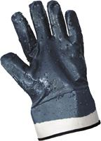 These gloves are constructed of blue fully dipped solid nitrile on two piece jersey liner with a safety cuff.