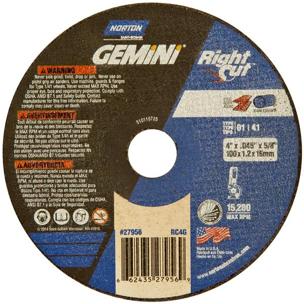 4 x .045 x 5/8 Inch Gemini Right Cut EVO Right Angle Cut-Off Wheel 46 Grit Aluminum Oxide Type 01/41
