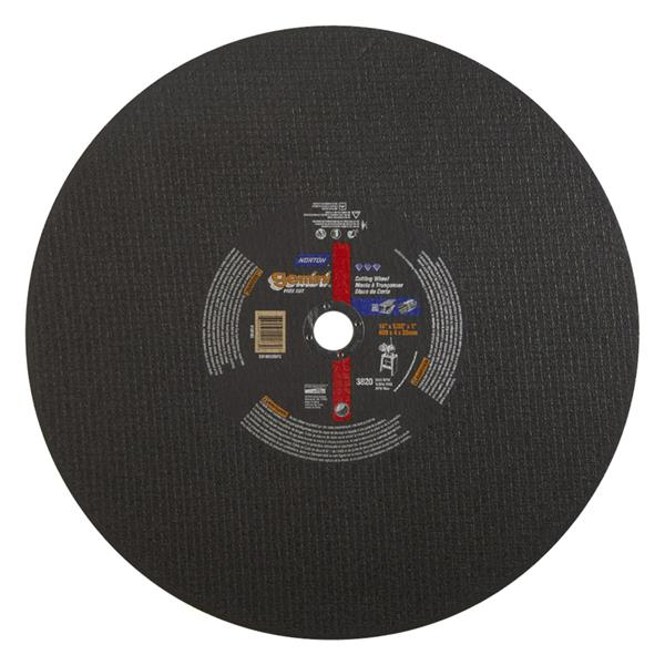 The Norton stationary saw reinforced cut-off wheel line consists of type 01 straight 10 In. - 24 In. wheels, designed to fit on fixed-base stationary saws that are free-standing or mounted on a workbench. The primary applications are cutting all metal (flat stock, bars, studs, pipes, tubes, angle iron, cable) and non-metallic parts.