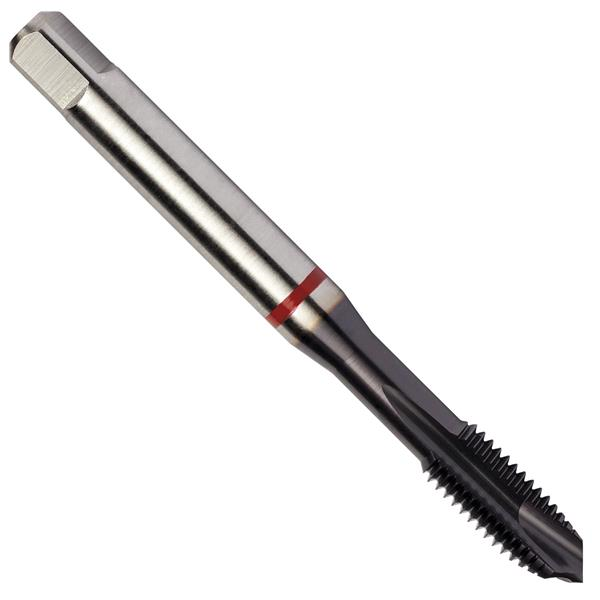 Spiral point tap Red Shark with chamfer form B with a 3.5-5xP plug lead, for Unified National Fine thread UNF 10 with 32 TPI and 2B class of fit with H3 pitch diameter limits, dimensions according to DIN/ANSI standard with 0.1940" shank and 0.1500" square drive, powder metallurgical HSS-E with TiAlN-Top coating for 2.5xD through hole threading in plain carbon, alloy and tool steel
