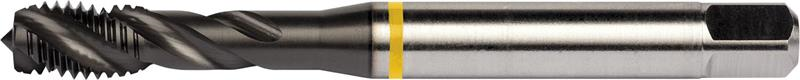 Spiral flute tap Yellow Shark with chamfer form C with a 2-3xP semi-bottoming lead, for ISO-Metric thread M5 with 0.80 mm pitch and 6H class of fit with D4 pitch diameter limits, dimensions according to DIN/ANSI standard with 0.1940" shank and 0.1500" square drive, powder metallurgical HSS-E with TiAlN-Top coating and 40? helix angle for 2xD blind hole threading in free machining and plain carbon steel and copper or copper alloys
