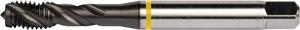 Spiral flute tap Yellow Shark with chamfer form C with a 2-3xP semi-bottoming lead, for ISO-Metric thread M6 with 1.00 mm pitch and 6H class of fit with D5 pitch diameter limits, dimensions according to DIN/ANSI standard with 0.2550" shank and 0.1890" square drive, powder metallurgical HSS-E with TiAlN-Top coating and 40? helix angle for 2xD blind hole threading in free machining and plain carbon steel and copper or copper alloys