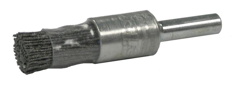 Featuring an integral stem for convenient mounting into a tool holder or collet. Nylon End Brushes and Miniature End Brushes are suitable for addressing recesses and internal features, or delivering a targeted brushing action to a specific area on a part. Burr-Rx End Brushes: Banded, Crimped Round Black Ceramic Filament, Mounted on 1/4" Stems.